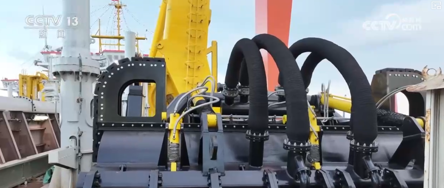 耙头是耙吸挖泥船的核心部件,相当于海底作业的“挖掘手”。2艘船上我国自主研制的系列化耙头最大可伸至约40层楼高的海底吸挖泥沙。高压冲水破土压力相当于一个成年人手掌上站一只5吨大象的压力,破土效率更高、挖掘性能更强。
